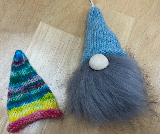 All you need to make (pattern, faux fur pompom, nose, fiberfill stuffing, yarn for a solid hat and a multicolored hat)